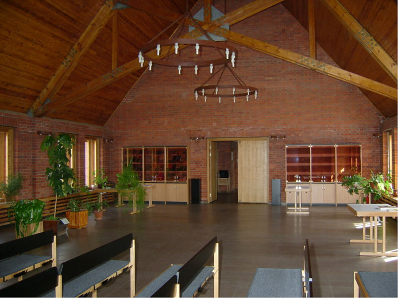 „Die räumlich-konstruktive Gestaltung dieses Kirchenraumes erinnert aber auch an eine geistig wie materiell ähnlich schwierige Zeit, an das zerstörte Deutschland, als 1948 eine Anzahl sogenannter Notkirchen gebaut wurden. Der Architekt dieser insgesamt 48 Kirchen, Otto Bartning, selbst ein sprachmächtiger „Prediger“, schrieb damals: „ Die Kirchen sind unscheinbar nach außen, ein wenig wehrhaft, doch erscheinen sei als erste Zeichen erneuerter uralter Ordnung. Sie sind schlicht im Inneren … Alle Menschen werden klar und einfach, demütig stolz in diesem Raum. Und es bildet sich Gemeinschaft.“